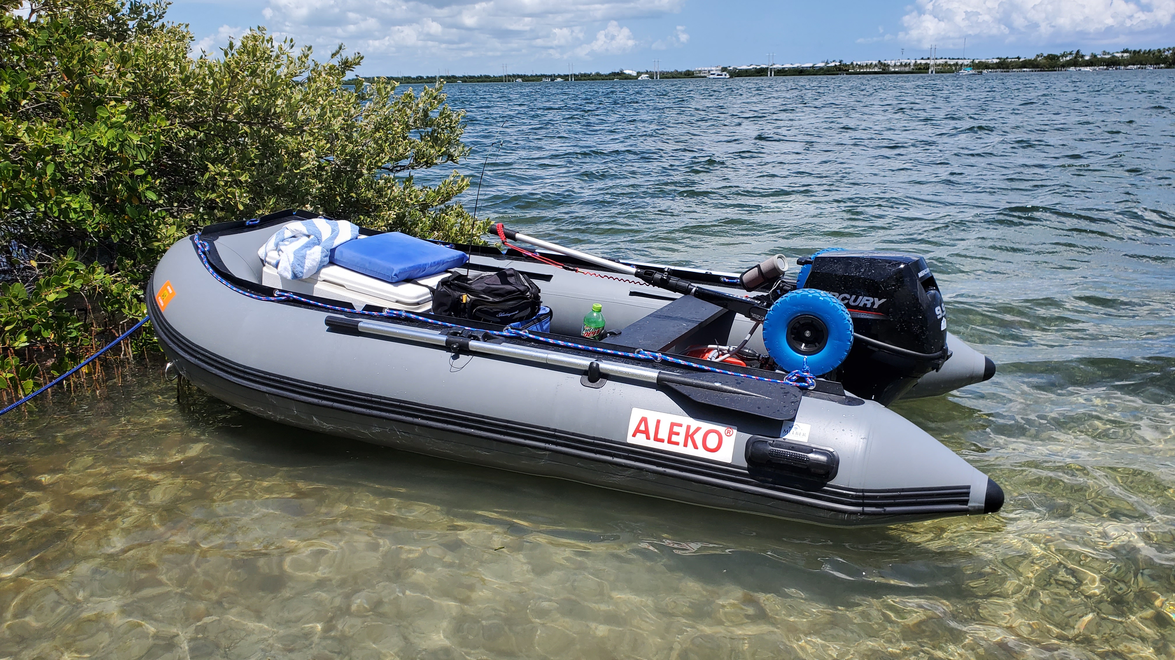 Our 8.4 ft (2.6 m) Inflatable Boats with Aluminum Floor are high performance, heavy duty salt and freshwater inflatable sport dinghy tender boats. Can handle both 2 or 4 stroke motors. ALEKO inflatable boats are perfect for sport, fishing, diving trips, river rafting, family adventure vacations, and have been used by coast guard. Boat is tested and designed for both 15" (38.1 cm) short shaft outboards and 20" (51 cm) long shaft. Terrific value and fast shipping! Boat is 1.2 mm polyester reinforced and anti-corrosive coated PVC. Comes with: Aluminum Flooring Set, 1 bench seat, 2 aluminum oars, tie-down straps for battery boxes and gas tanks (battery box and gas tanks not included), carrying & storage bag, foot pump, one way drain plug, towing D-rings, 4 mounted carrying handles, oar locks and oar holders, pre-packed repair kit (GLUE IS NOT INCLUDED) and splash guards.