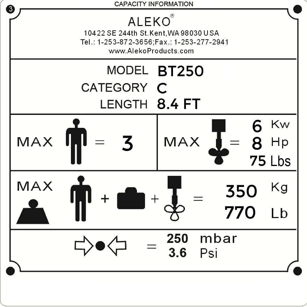 Max. Passenger Capacity: 3 or 695 lb / 315 kg *** Max. Load Capacity:770 lb / 350 kg *** Max. Motor Power: 8 HP / 6 kW *** Max. Motor Weight:75 lb / 34 kg