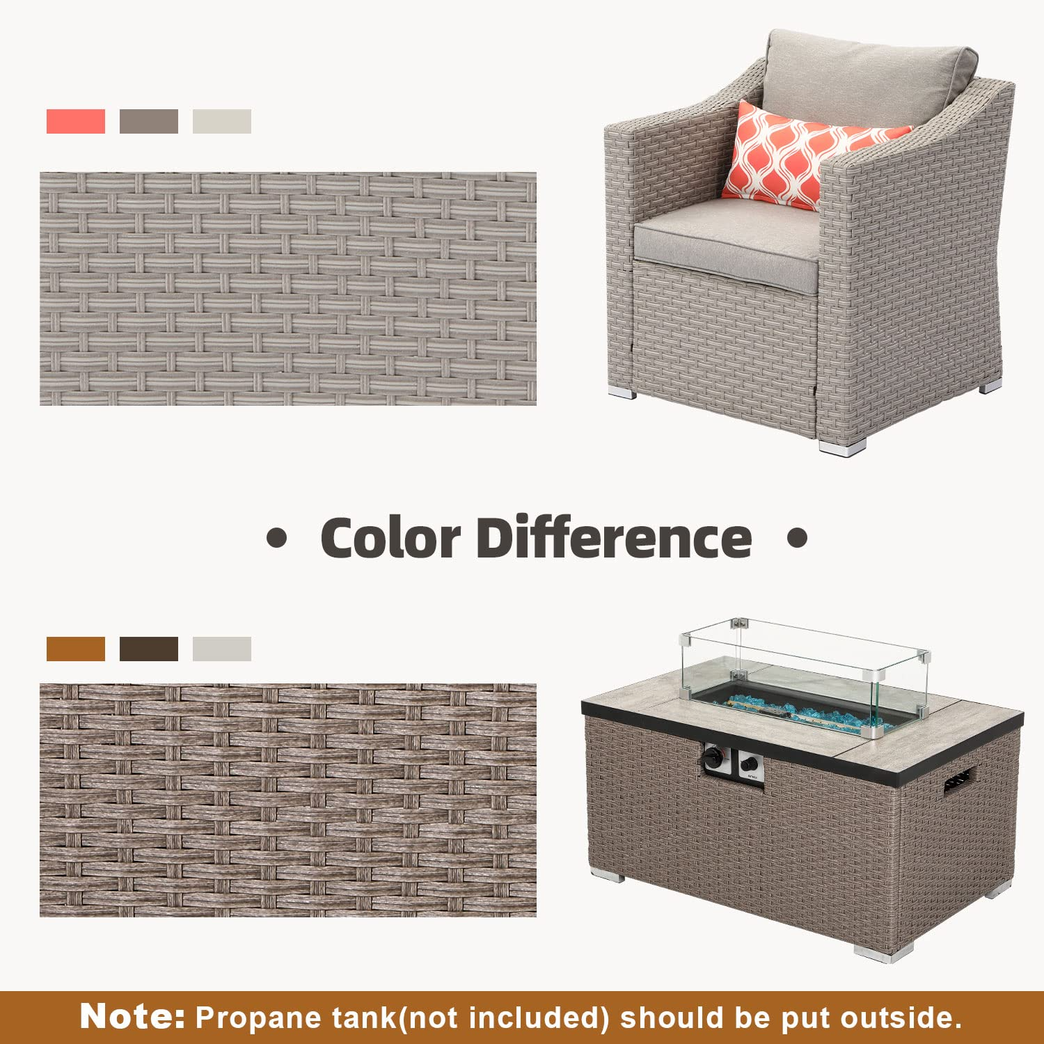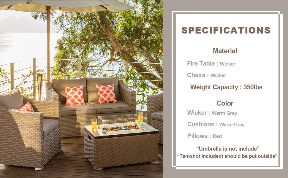 🔥【 Stylish Patio Fun 】:Outdoor comfort never looked so good! The comfort is elevated by 4-inch thick high-density foam seat and back cushions and 4 cute pillows. We've even included a roomy glass-top coffee table perfect for serving foods. The rectangle ceramic top fire table made by all weather synthetic PE resin wicker(Wicker color of fire table and sofa are different). Clean burning propane flame provides soothing warmth and a centerpiece for outdoor evenings worth remembering.